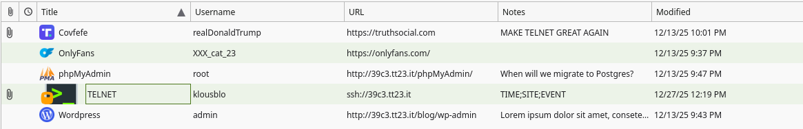 In order to login into the SSH server you had to create the public key first, as otherwise ssh does not try to only use the private-key: ssh-keygen -y -f ~/.ssh/39c3-telnet > ~/.ssh/39c3-telnet.pub. Afterwards you could try to login into the ssh server of the keepass database, however the server from the keepass database (39c3.tt23.it) rejected the private key and wanted the password. Instead you had to use the initial telnet server (telnet.tt23.it). This server however also rejected any ssh logins: PTY allocation request failed on channel 2.